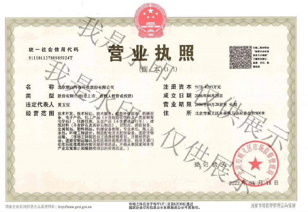 北京潮白环保科技股份有限公司是一家专业从事环境保护与资源循环利用的综合性高新技术企业,注册资金5178万元,成立伊始就组建顾问专家团队加强创新引领,拥有高级、中级职称人员及各类技术人员占比超过50%。